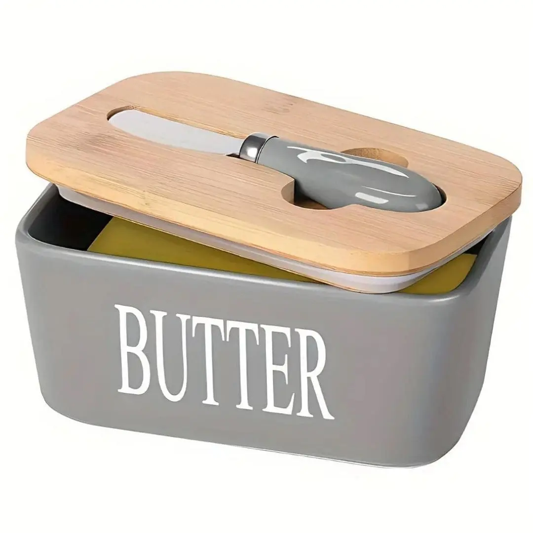 Ceramic Butter Dish with bamboo lid and butter knife (Large)